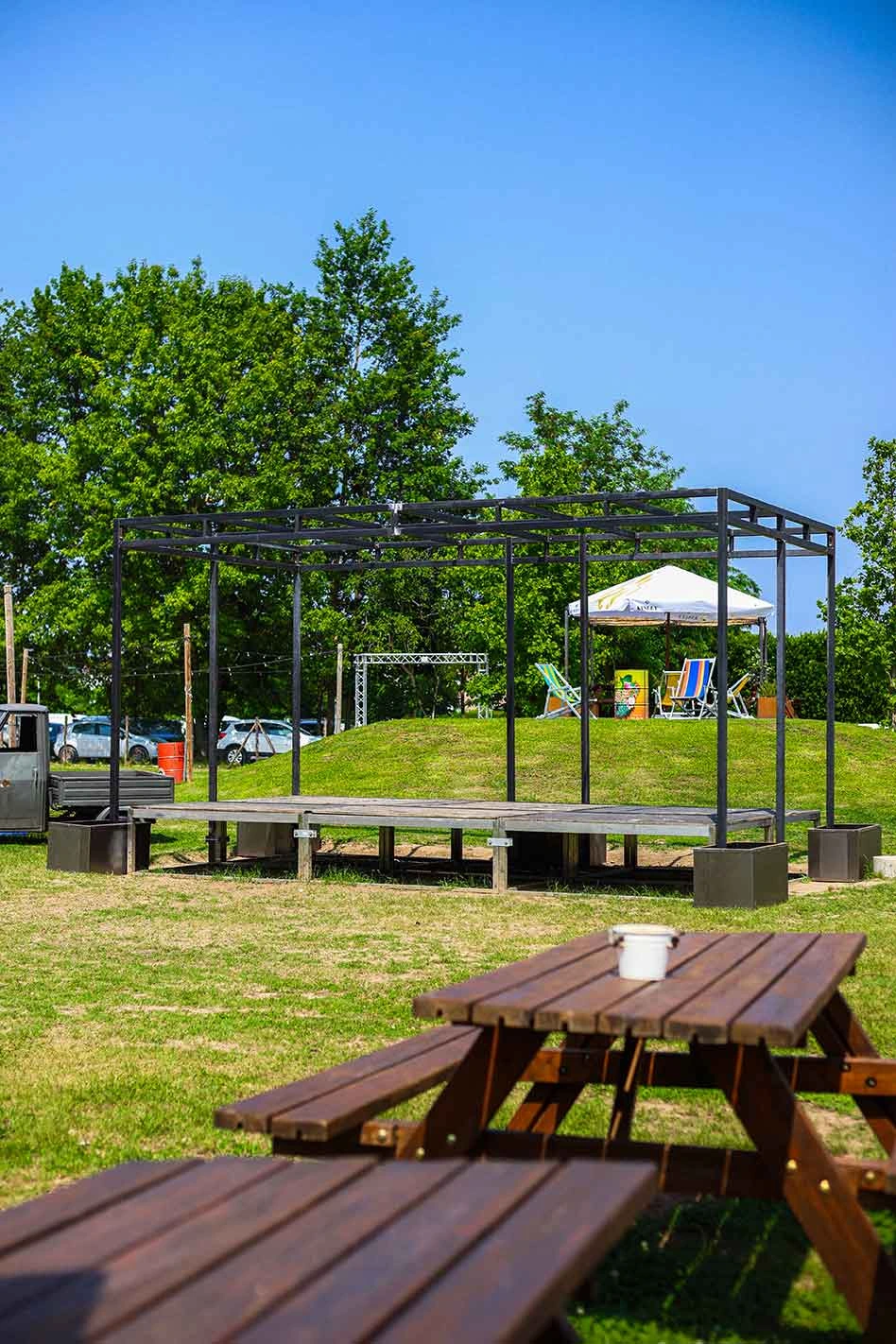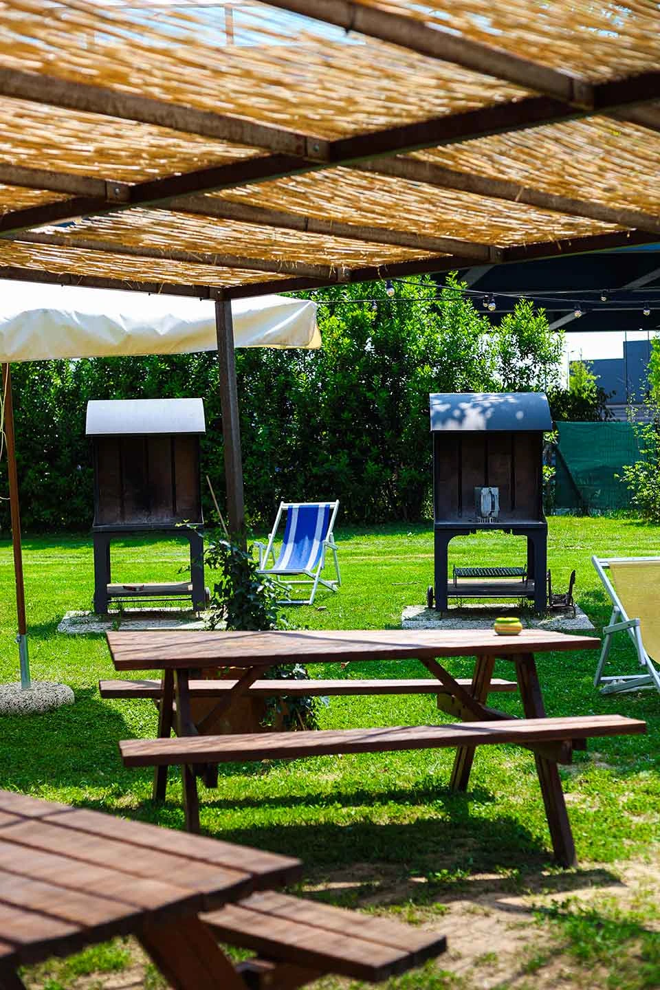 ombrelloni, tavoli, barbecue su